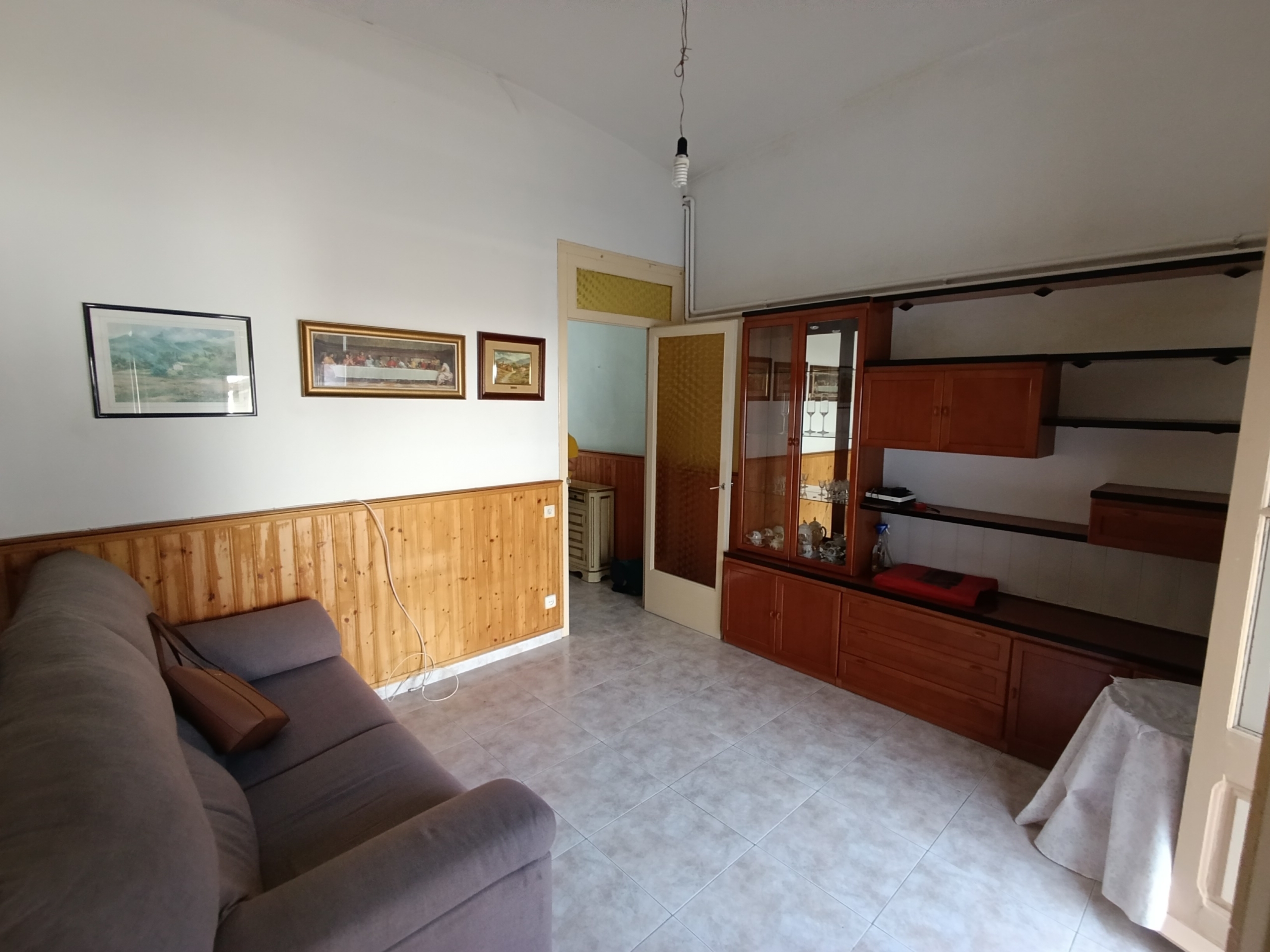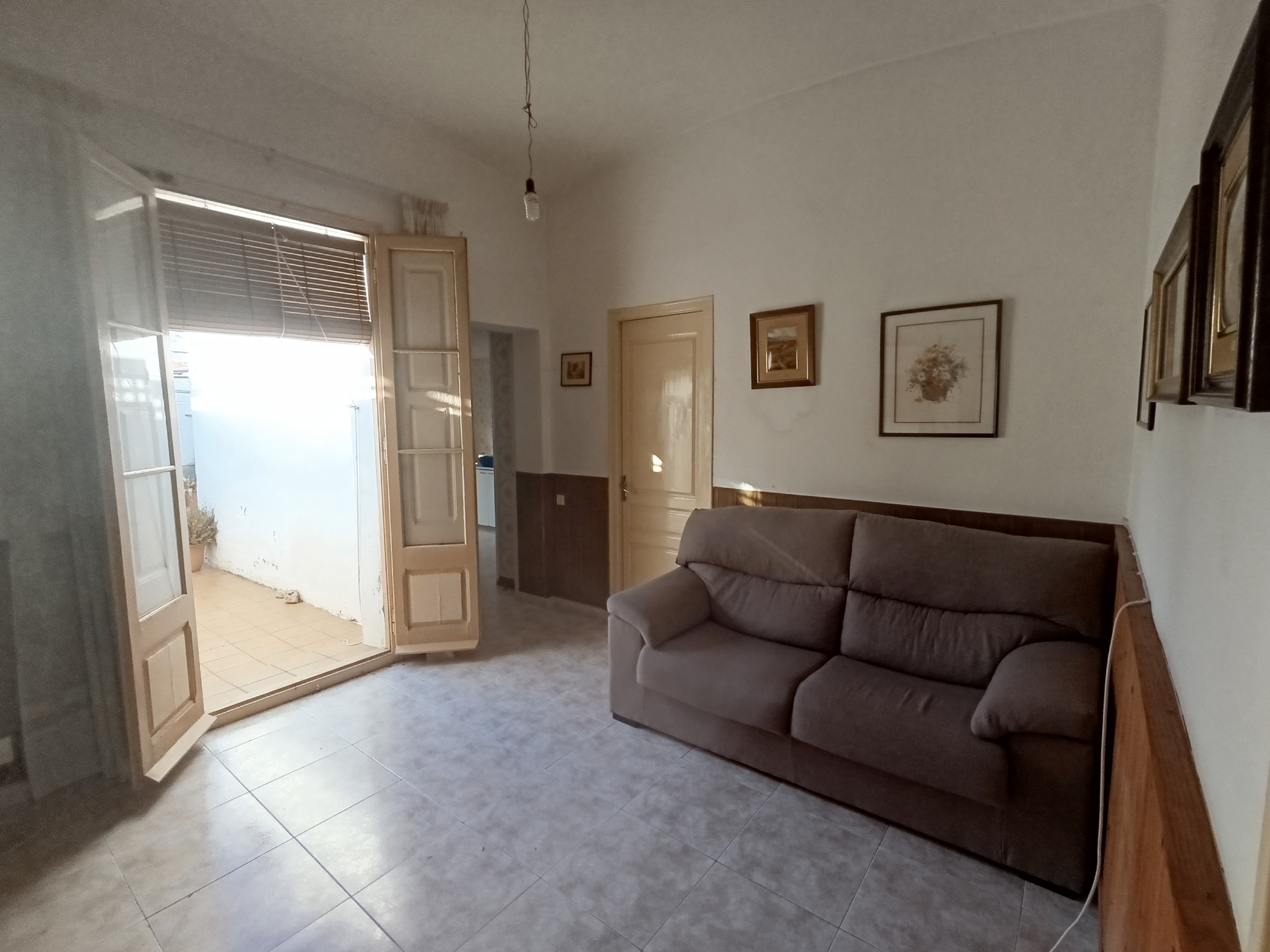 La casa esta divida en dos plantas. A pie de calle nos encontramos con las principales estancias de día, salón comedor con acceso al gran patio y conectado al garaje privado, la cocina, un baño. Además de una habitación doble, antiguamente sala de estar, y un segundo baño.